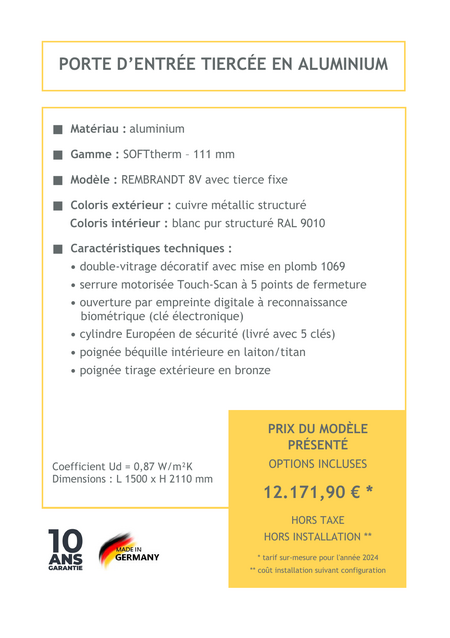 La porte d'entrée en aluminium offre une combinaison parfaite de sécurité, modernité et élégance, idéale pour sublimer votre façade. Avec sa structure robuste et légère, elle résiste aux intempéries sans se déformer, tout en nécessitant peu d'entretien. Disponible dans une variété de finitions et de couleurs, cette porte apporte une touche contemporaine à votre maison tout en assurant une isolation optimale.